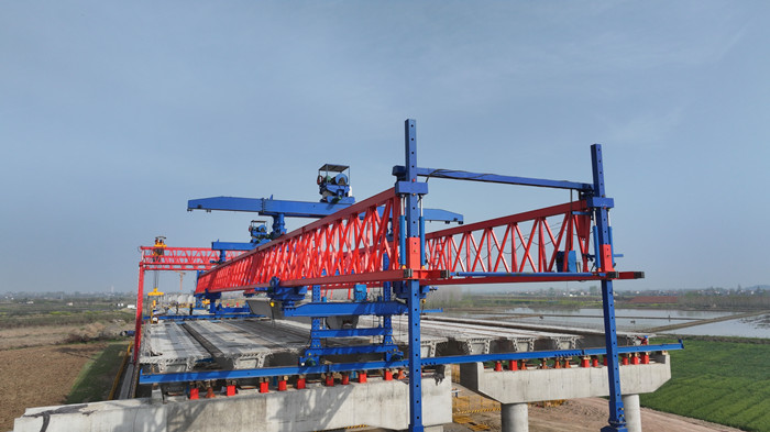 項目沿線處于長江沖洪積平原地區(qū),地下水豐富、沿線魚塘密布,周邊建筑材料資源匱乏。為此,項目團隊通過采用膜袋吹砂快速成型工藝進行水網密布區(qū)域便道修筑、設置鉆渣改良基地等方式確保了施工進度。本次鋼混梁的成功吊裝,先后攻克“大構件、高精度、強協(xié)同”三大難關,為后續(xù)橋面鋪裝、附屬設施安裝奠定堅實基礎。