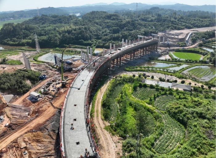 7月3日,通城至修水高速公路(湖北段)項(xiàng)目沙坪北互通D匝道首聯(lián)現(xiàn)澆梁順利完成澆筑,設(shè)計(jì)為單箱單室預(yù)應(yīng)力混凝土現(xiàn)澆箱梁,現(xiàn)澆箱梁長100米,梁高1.6米,橋面寬度9米,這標(biāo)志著項(xiàng)目上部結(jié)構(gòu)施工取得重大進(jìn)展,為項(xiàng)目后續(xù)建設(shè)按下了“快進(jìn)鍵”。