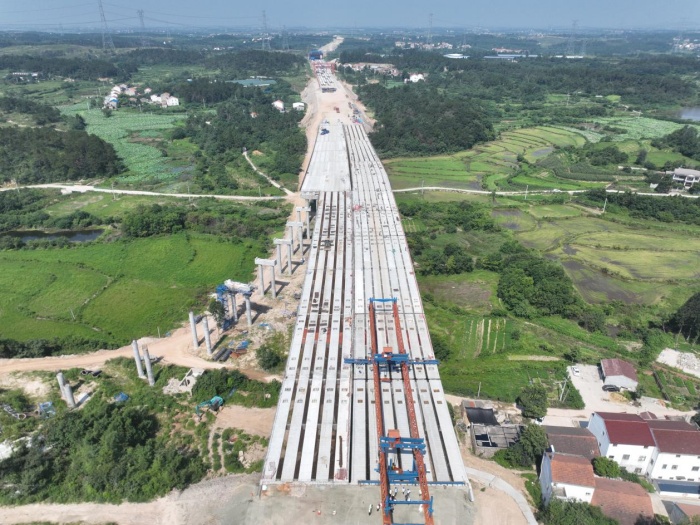 寨坡腳大橋位于湖北省黃岡市紅安縣,連接項目2#梁場與太平橋互通段,橋梁全長367米,需完成155片預(yù)制箱梁架設(shè)任務(wù)。橋梁前6跨采用簡支梁結(jié)構(gòu),后6跨為連續(xù)梁,全橋采用變截面設(shè)計,同時銜接多個匝道,該橋復(fù)雜的變截面設(shè)計對架設(shè)精度要求極高,多匝道銜接更增加了施工難度。為確保預(yù)制箱梁順利架設(shè),項目團隊超前謀劃,組織參建單位制定專項運輸方案,全程復(fù)測標(biāo)高,專人旁站監(jiān)督,成功打通施工關(guān)鍵節(jié)點,全方位保障首橋貫通。