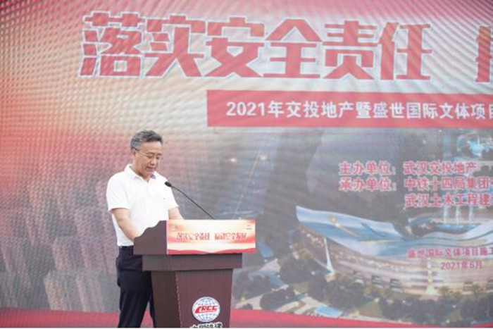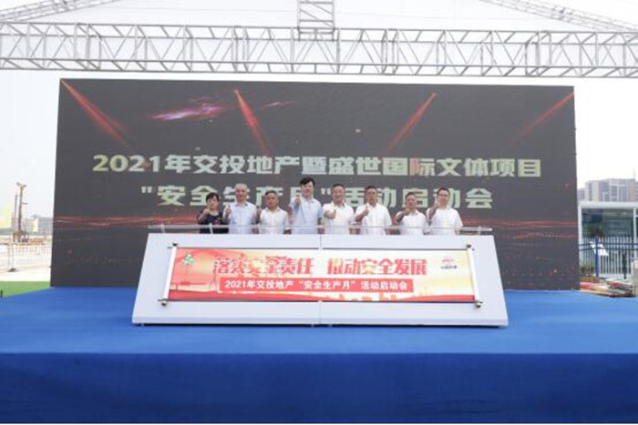 今年6月是全國(guó)第20個(gè)“安全生產(chǎn)月”,為深入貫徹落實(shí)省、市和武漢交投集團(tuán)關(guān)于安全生產(chǎn)工作的相關(guān)要求,全面落實(shí)企業(yè)安全生產(chǎn)主體責(zé)任,營(yíng)造“人人講安全、人人要安全、人人會(huì)安全”的濃厚氛圍,6月2日上午,武漢交投集團(tuán)和縱盛地產(chǎn)公司在盛世國(guó)際文體項(xiàng)目施工現(xiàn)場(chǎng)舉辦了2021年“安全生產(chǎn)月”活動(dòng)啟動(dòng)會(huì)。黃陂區(qū)橫店街道人大主任羅學(xué)峰、交投集團(tuán)副總經(jīng)理文兵、交投集團(tuán)安全部部長(zhǎng)汪幫平、交投集團(tuán)和縱盛地產(chǎn)公司總經(jīng)理尹水章等領(lǐng)導(dǎo)蒞臨指導(dǎo),地產(chǎn)公司各部門負(fù)責(zé)人、各項(xiàng)目辦負(fù)責(zé)人、各項(xiàng)目施工、監(jiān)理單位代表參加了啟動(dòng)會(huì)。